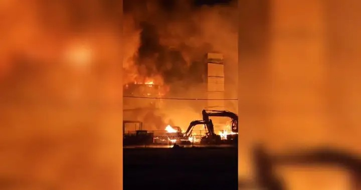 The blaze has since spread through the entire building. Flames have breached the roof, windows have burst from the heat, and embers are being carried into the nearby Canadian Tire parking lot. Crews continue working to keep the fire from spreading to neighboring businesses.