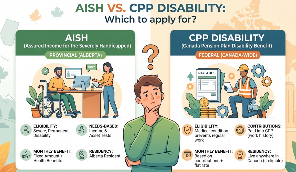 If you are living with a permanent disability in Alberta and trying to figure out your options, you have probably heard of both AISH and CPP Disability. On the surface they sound similar monthly payments for people who cannot work. But the two programs operate completely differently, and applying for the wrong one first can cost you time, money, and income.
