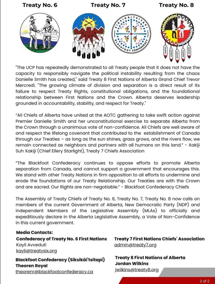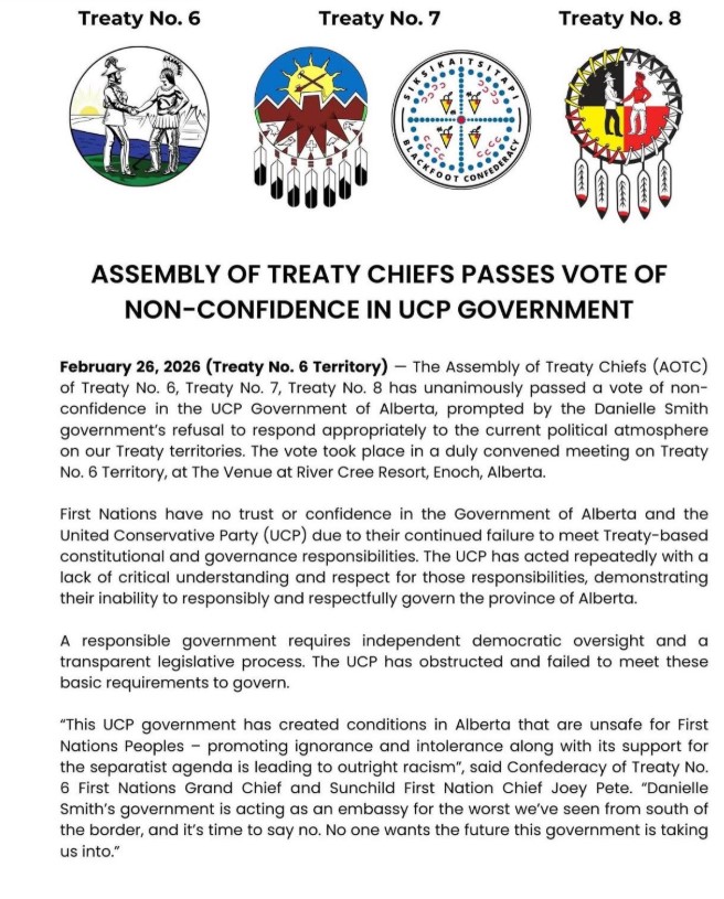 The Assembly of Treaty Chiefs formally and unanimously passed a vote of non-confidence in the United Conservative Party government of Alberta. The AOTC's own statement said the move was triggered by the Danielle Smith government's "refusal to respond appropriately to the current political atmosphere on our Treaty territories."
