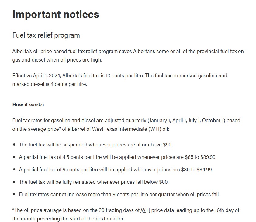 The province reinstated the full 13-cent-per-litre fuel tax back in April 2024 after oil dropped below the $80 USD threshold. It's still in effect now. Under Alberta's system, the tax gets suspended when WTI hits $90 or higher, partially reduced between $80-90, and fully applied below $80.