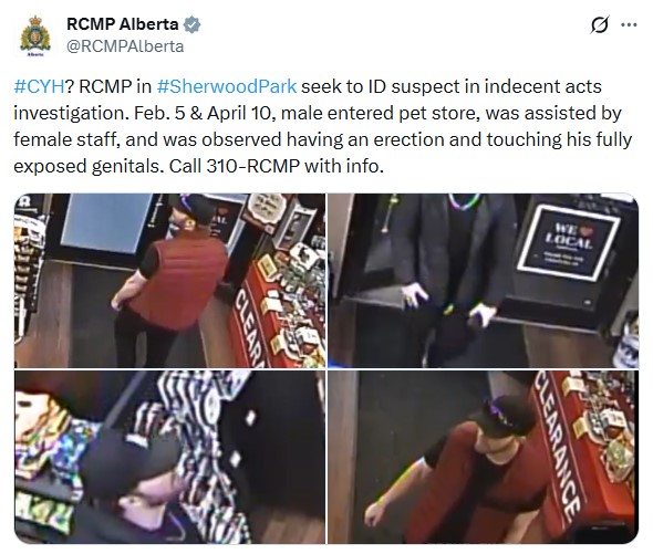 RCMP are asking for the public’s help identifying a man accused of exposing himself to a female employee at a Sherwood Park pet store on two separate occasions earlier this year.