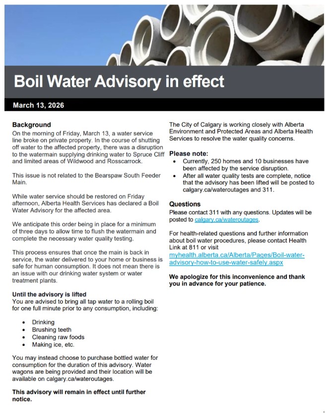 On Friday morning, a water service line failed somewhere in Spruce Cliff. When crews moved to shut the water off to that property, the process knocked pressure out of the watermain feeding the surrounding neighbourhood and Alberta Health Services didn't wait around. By Friday afternoon, AHS had ordered the City of Calgary to issue a Boil Water Advisory covering roughly 500 homes and businesses across Spruce Cliff and limited areas of Wildwood and Rosscarrock.