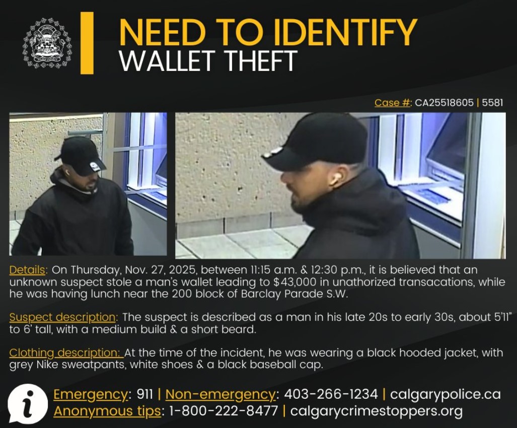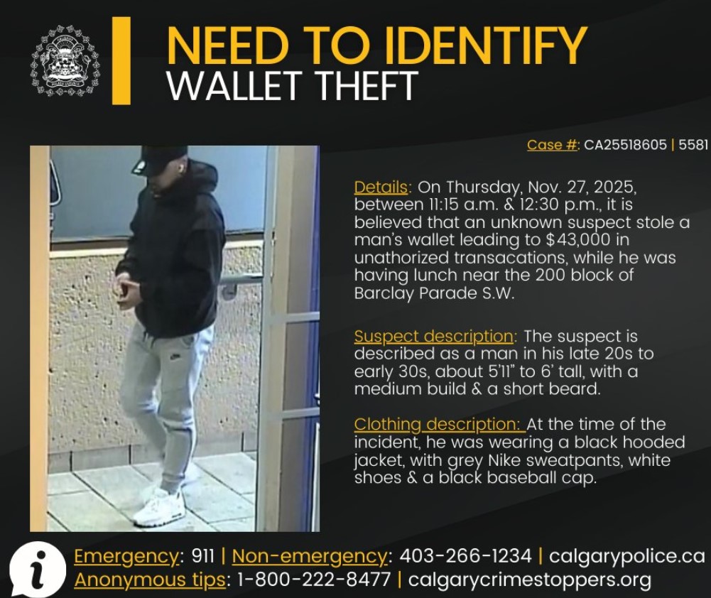 According to the Calgary Police Service (CPS), the victim had temporarily draped his jacket over the back of his chair while dining. Investigators believe an unknown suspect approached the chair from behind and removed the wallet from the jacket pocket. The victim did not realize the wallet was missing until after the suspect had left the area.