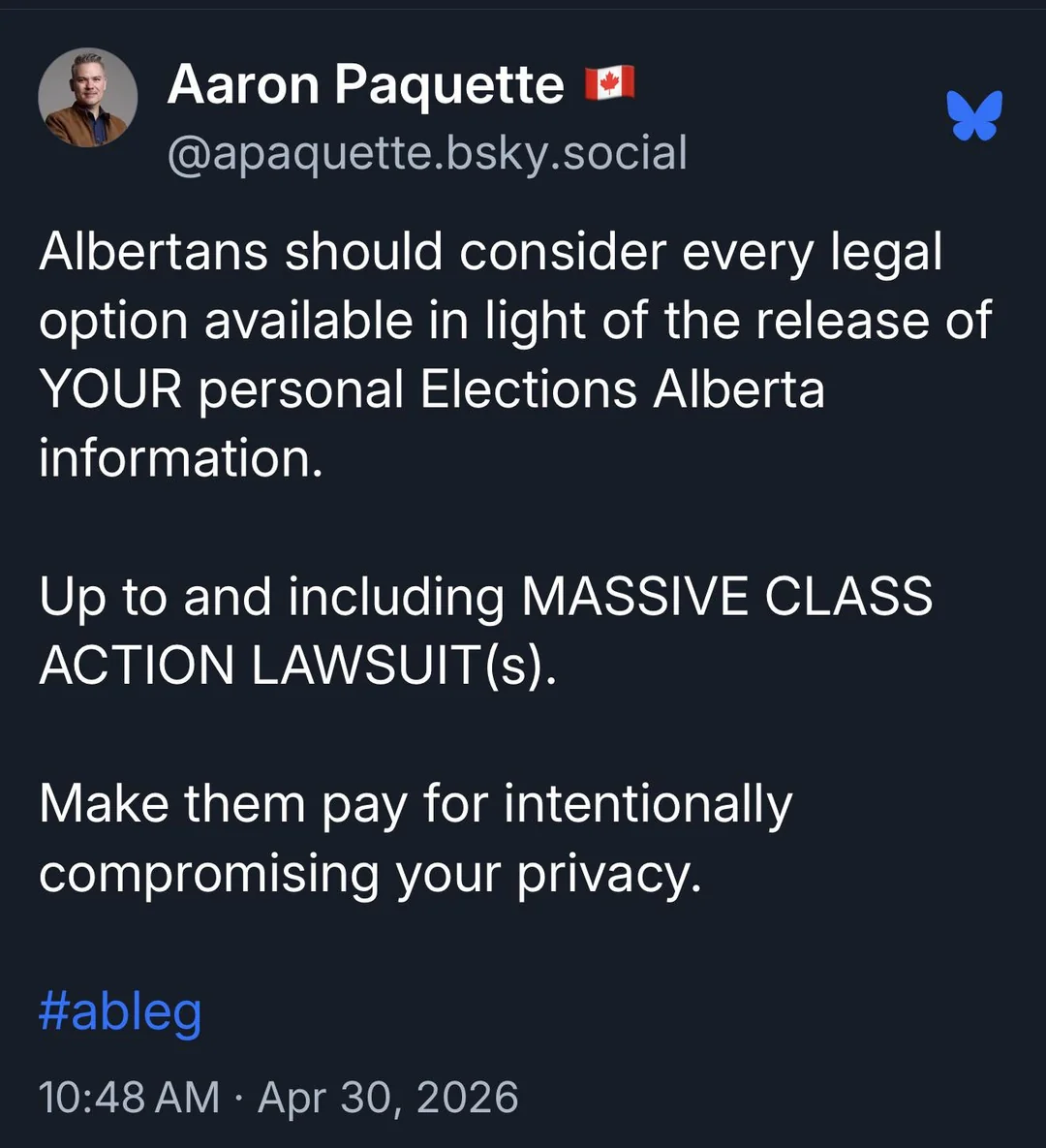 The breach immediately triggered concerns about privacy, political data use, and the consequences of breaking election laws. Edmonton City Councillor Aaron Paquette took to social media to urge Albertans to explore legal action against whoever is responsible, writing: "Up to and including MASSIVE CLASS ACTION LAWSUIT(s). Make them pay for intentionally compromising your privacy."