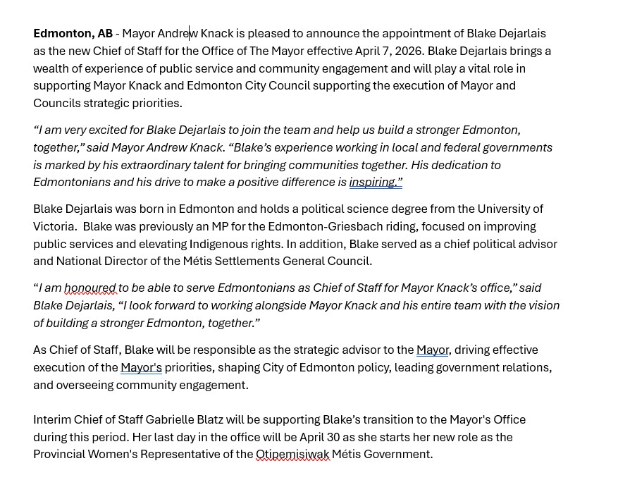 Edmonton Mayor Andrew Knack has appointed Blake Desjarlais, a former federal NDP MP, as Chief of Staff for the Office of the Mayor, effective April 7, 2026.