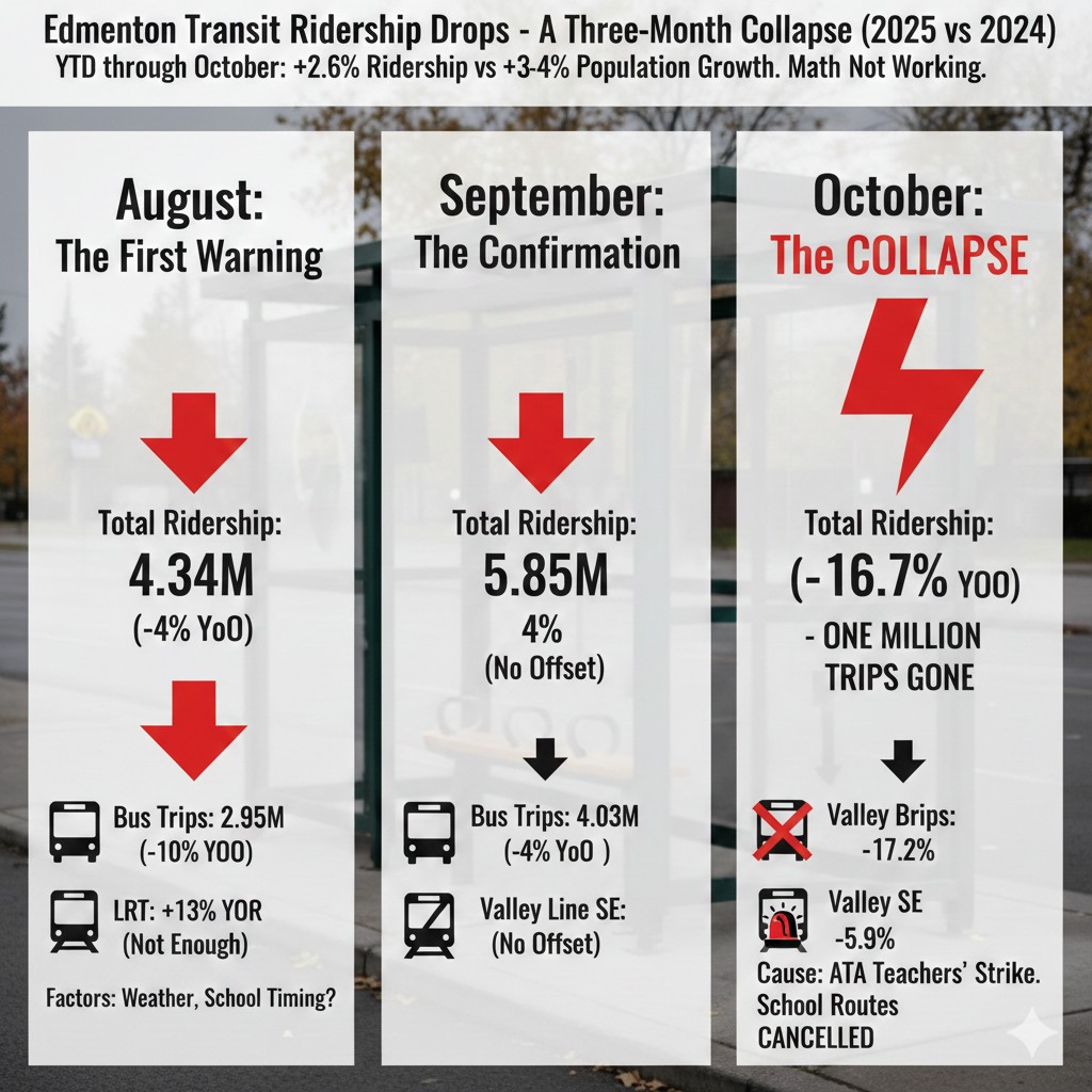 Then October broke open. Total ridership collapsed 16.7% from 6.45 million in October 2024 down to 5.37 million. That's over one million trips gone in a single month. The Alberta Teachers' Association strike wiped out student ridership overnight. Bus trips fell 17.2%, weekday boardings dropped 18%, and ETS cancelled most of its 600-series school special routes outright. Even the Valley Line Southeast slipped 5.9%.