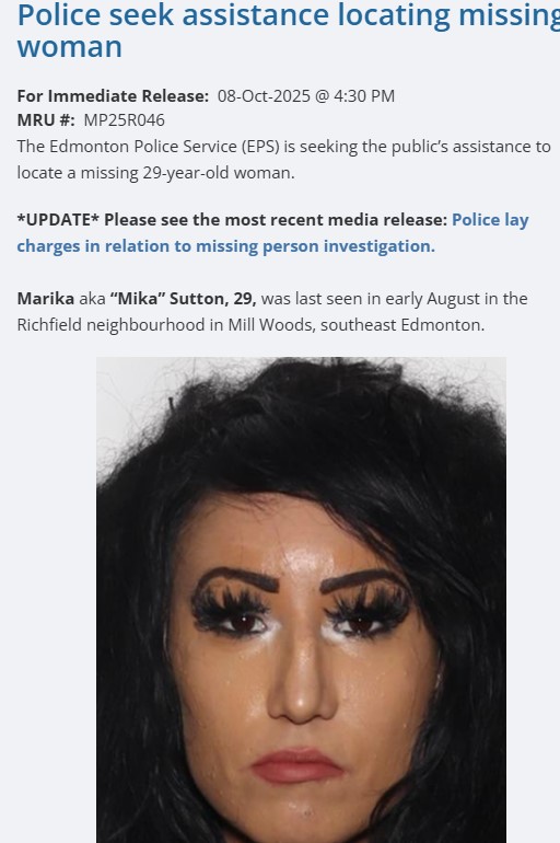 Anyone with information about Marika Sutton's disappearance or death is asked to contact EPS at 780-423-4567 or #377 from a mobile phone. Anonymous tips can be submitted to Crime Stoppers at 1-800-222-8477 or at p3tips.com.