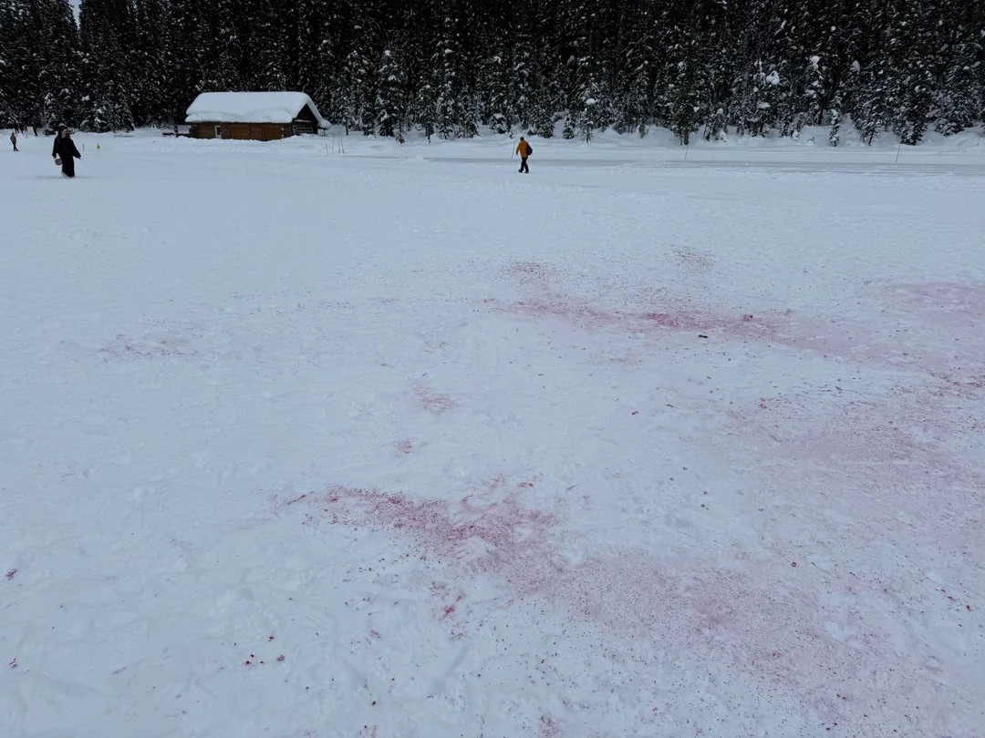 On Saturday, January 31st, a family set off a confetti cannon on Lake Louise to announce their baby's gender, leaving behind a large pink-stained area on the ice and hundreds of metallic confetti pieces scattered across the frozen surface.