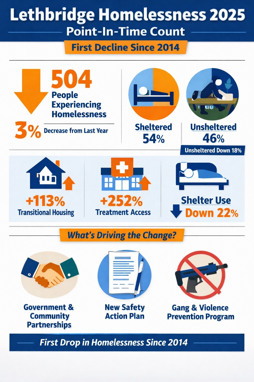 Lethbridge city's 2025 Point-In-Time Count, conducted on the night of October 2, found 504 people experiencing homelessness in Lethbridge. That's a 3% drop from the previous year modest on paper, but historically significant. It's the first recorded decline since the city began tracking homelessness in 2014.