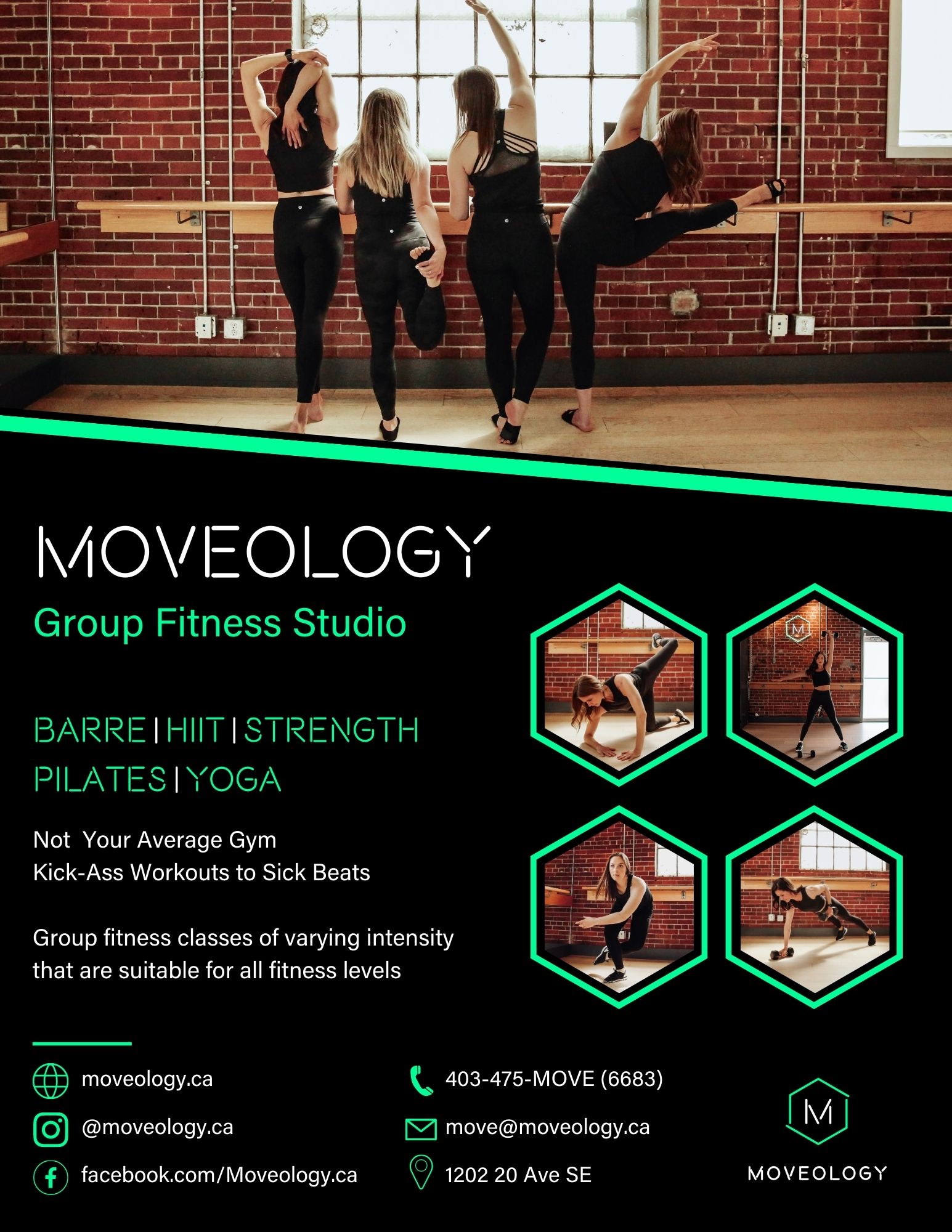Moveology is located at 1202 20 Ave SE in Calgary's Inglewood neighbourhood. Classes run throughout the day, seven days a week. First-timers can book the three-class intro at moveology.ca.