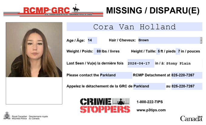 Anyone with information on Cora's whereabouts is asked to contact the Parkland RCMP Detachment at 825-220-7267 or their local police. Those who wish to remain anonymous can contact Crime Stoppers at 1-800-222-TIPS (8477), online at p3tips.com, or through the P3 Tips app.