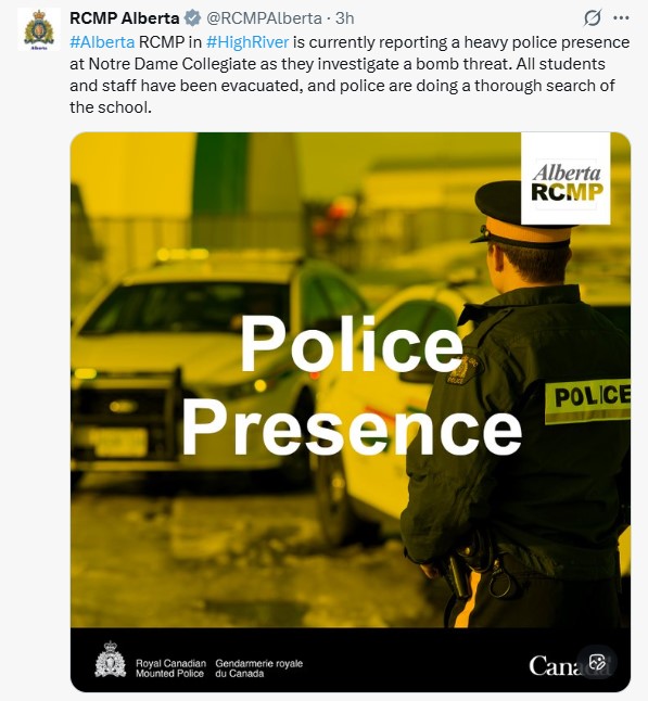 A school in High River, roughly 40 kilometres south of Calgary, was evacuated Tuesday after a bomb threat triggered a police investigation.