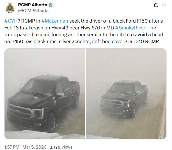 Source: McLennan RCMP via Alberta RCMP (@RCMPAlberta on X, March 2026). No charges have been laid. Investigation is ongoing.