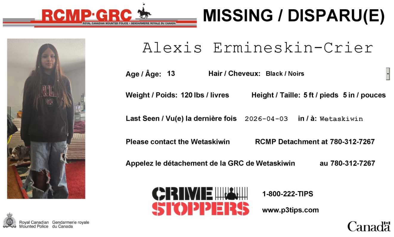 The Royal Canadian Mounted Police and the family of Alexis Ermineskin-Crier are asking for the public's help in locating a 13-year-old girl missing from Wetaskiwin, Alberta.