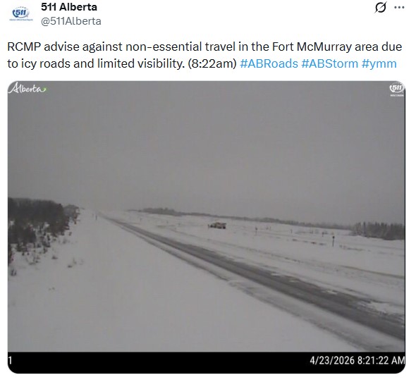 RCMP issued a travel advisory for the Fort McMurray area Thursday morning as a significant late-April snowstorm moved through the region, bringing icy roads and near-zero visibility to highways in and around the city.