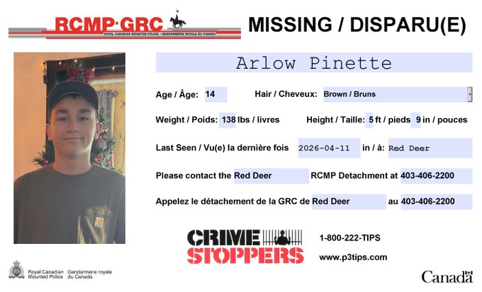 Arlow Pinette, 14, was last seen in Red Deer, Alberta on April 11, 2026. That was six days ago. Red Deer RCMP say there is concern for his wellbeing.