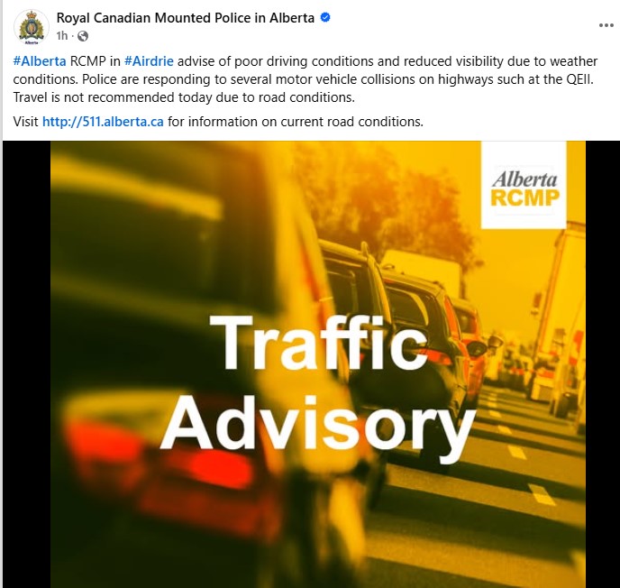 In Airdrie, RCMP issued a statement just before 12:30 p.m. asking residents to stay off the roads. Blowing snow was killing visibility on area highways, and officers were already responding to multiple collisions on the QE II.