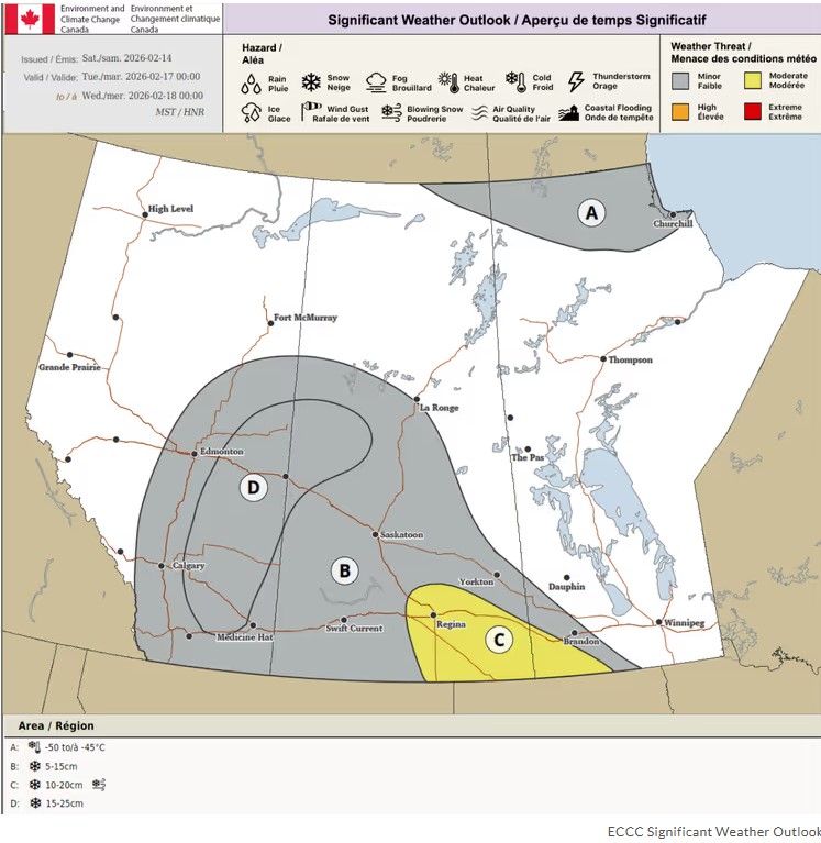 Source: Environment and Climate Change Canada, Special Weather Statement City of Calgary, issued February 15, 2026. weather.gc.ca